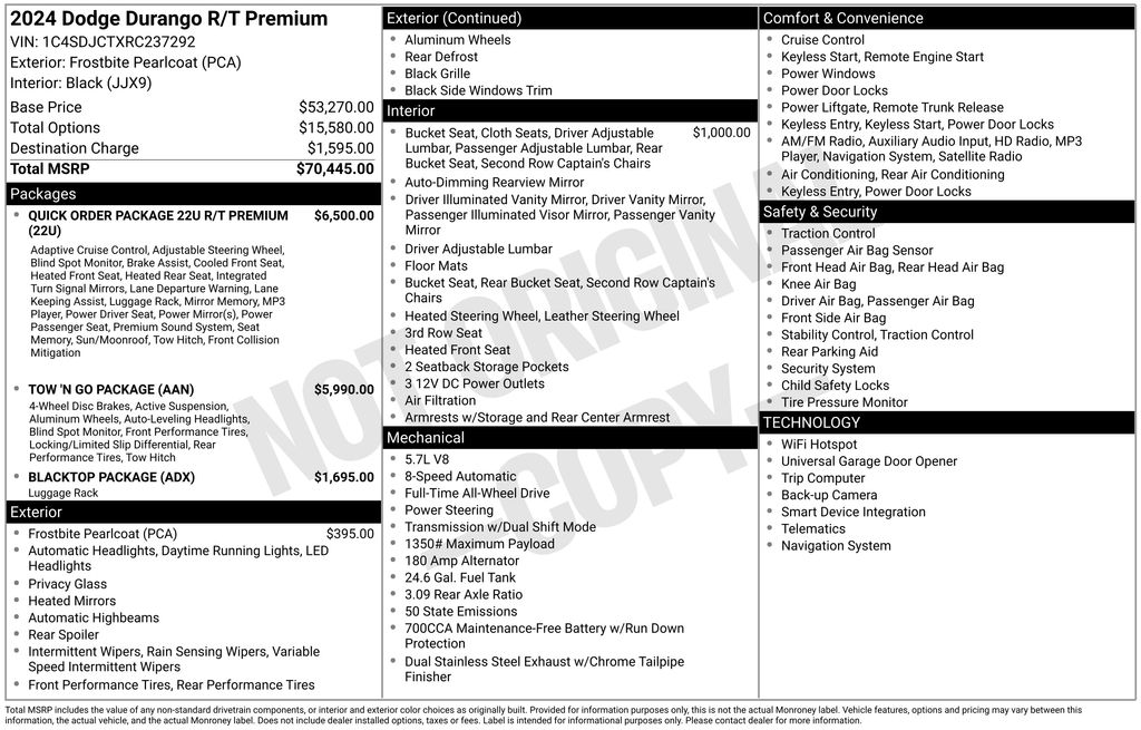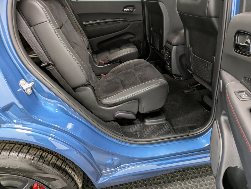 Powering this performance SUV is the legendary 5.7L HEMI V8 engine paired with an 8 speed automatic transmission and full time all wheel drive. This setup provides strong acceleration, confident handling, and impressive towing capability, especially with the Tow N Go Package. Performance focused features such as an active suspension system, locking limited slip differential, performance tires, and dual stainless steel exhaust enhance both ride quality and driving excitement. Whether commuting or towing, the Durango R/T Premium delivers the muscle Dodge is known for.